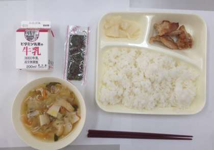 鶏肉のしょうゆマヨネーズ焼き、五目汁、かぶのゆず風味、焼きのり、ご飯、牛乳です。