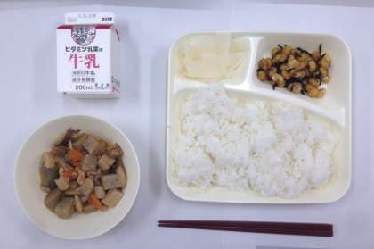 今日の給食の献立は、筑前煮、ひじき豆、だいこくのゆず風味、ご飯、牛乳でした。