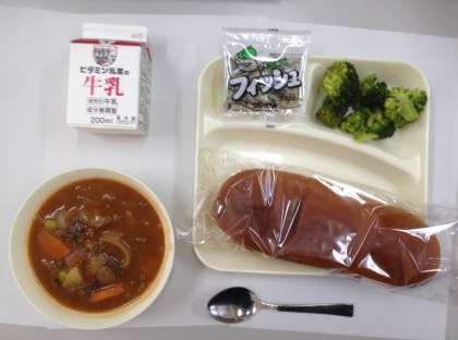 今日の給食の喫食は、ビーフシチュー、ブロッコリー、ミニフィッシュ、黒糖パン、牛乳です。