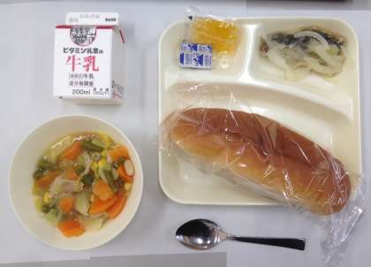 あじのマリネ、てぼ豆のスープ、固形チーズ、コッペパン、マーマレード、牛乳です。