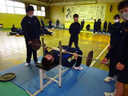 男子体育は授業後、ベンチプレスのことで盛り上がっていました。