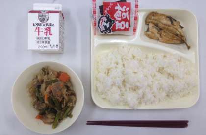いわしのしょうがじょうゆかけ、含め煮、いり大豆、ご飯、牛乳です。