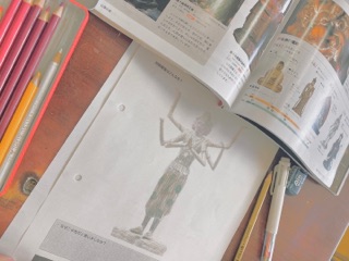 阿修羅像のもとの色は何色なのか…想像して色を塗っているところです。