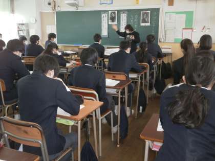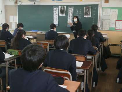 学年の先生方にて、ローテンションで道徳の授業をおこなっています。流石、書道部の顧問の先生です。