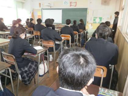 全校集会の様子です。密も避け、各クラス、教室にておこなっています。