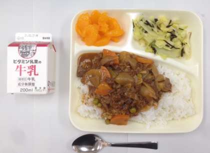 ハヤシライス、キャベツのひじきドレッシング、みかん、牛乳です。