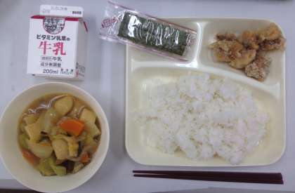 鶏肉のからあげ、まる天と野菜のうま煮、焼きのり、ご飯、牛乳です。