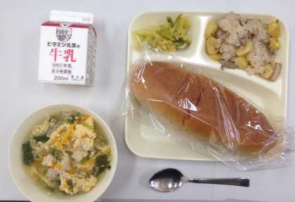 中華おこわ、卵スープ、キャベツとピーマンの炒めもの、黒糖パン、牛乳です。