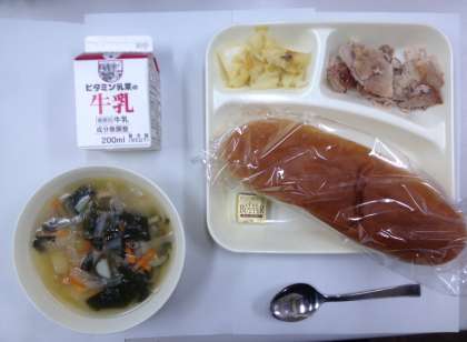 豚肉のガーリック焼き、スープ、サワーソテー、コッペパン、バター、牛乳です。