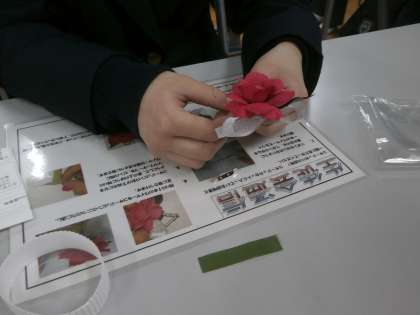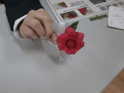 先日おこなわれたコサジューづくりの様子です。昨日の送別式の際に、3年生へ贈呈できました。