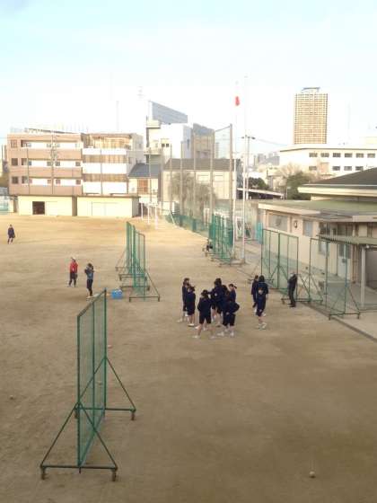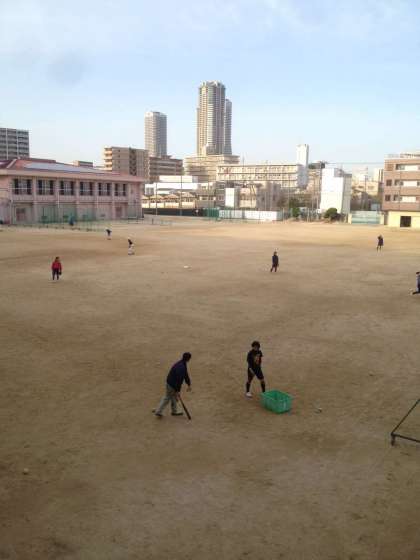 ソフトボール部では、なんと、管理作業員さんがノックをしてくれています。横では、バドミントン部が外練習をしています。