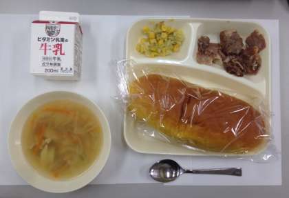 豚肉のデミグラスソース、スープ、キャベツのコーンソテー、パンプキンパン、牛乳です。