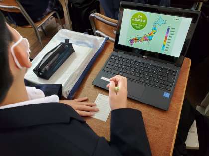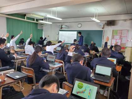 2年生の社会科は、授業の始まりに復習問題に取り組みます。答えの発表によく手があがっていました。