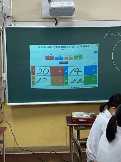 2組 「半径10?の円形のピザの面積が2倍となるには、半径を何?にすればよいか考える。
