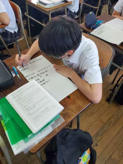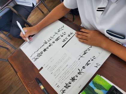 2年生の国語では「お気に入りの短歌を紹介しよう」というテーマで作品を作っています。今日はレイアウトを決めて、筆ペンの練習をしました。