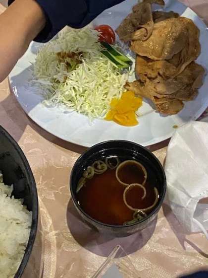 夕食は、生姜焼き、サラダ、味噌汁、ごはんです。
