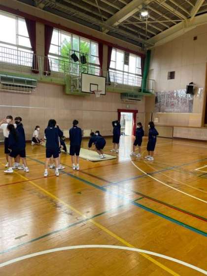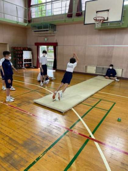 体育では体力測定を行なっています。写真は、3、4組の立ち幅跳びです。