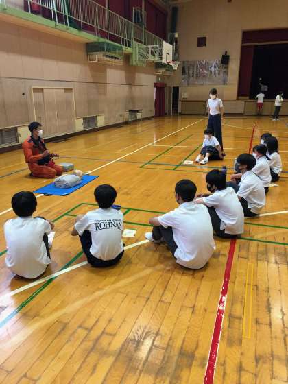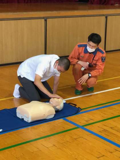 保健委員さんと、部活動の部長さんが参加しました。皆さん、消防隊員の指導を真剣に聞き、実習中は緊張した様子でした。