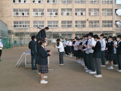 今回の全校集会では、「校則の見直し」について委員長と生徒会役員が意見を出し合った生徒評議会での様子を校長先生から話してもらいました。また、卓球部の表彰伝達が行われました。