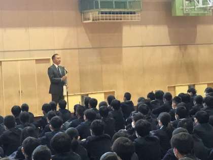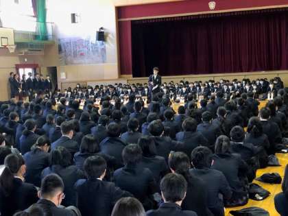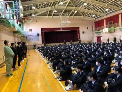 体育館にて、新しい校長先生からのご挨拶、新しく来られた先生のご紹介、生徒指導の先生からのお話、新学年の先生のご紹介、在校生と新入生代表のおことばが行われました。