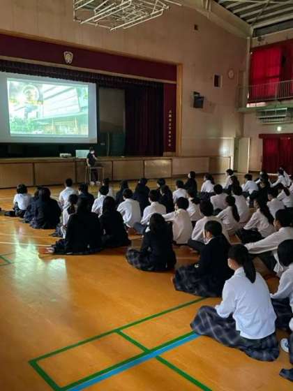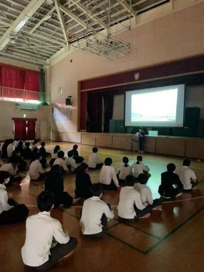 体育館にて6月の修学旅行の説明を行いました。みんな興味津々で楽しみに聞いていました。