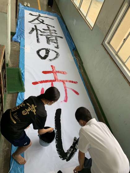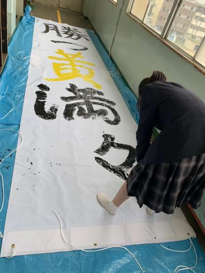 毎年、書道部では、体育大会のスローガンを大きな布に書いています。