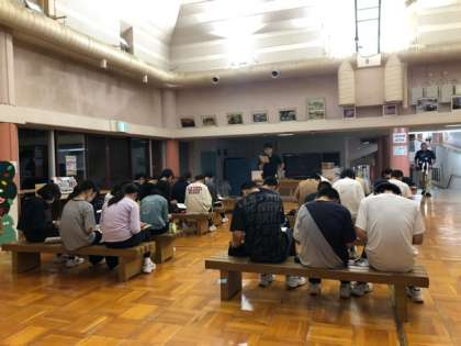 真剣に学年主任の先生のお話をメモしています。22時に完全消灯となります。