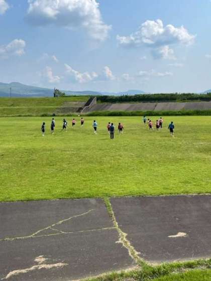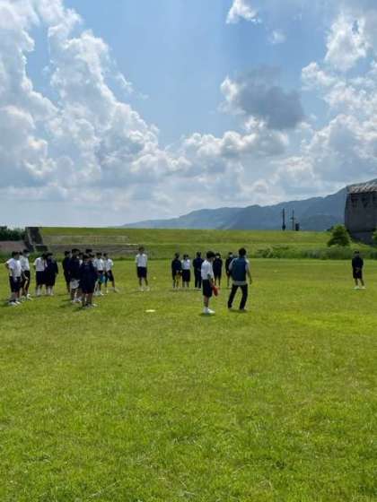 阿蘇の広大な土地で、アルティメットの体験。体育とはまた違うより本格的な試合形式に、みんな真剣に取り組んでいます。
