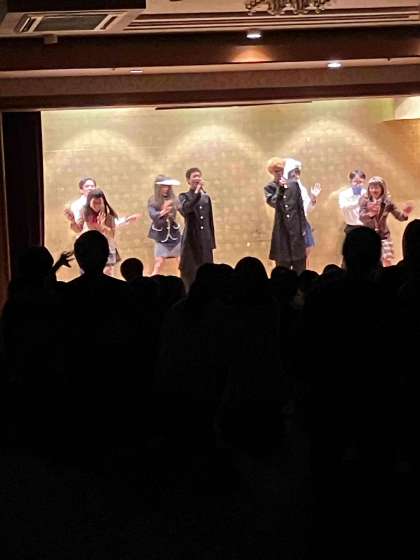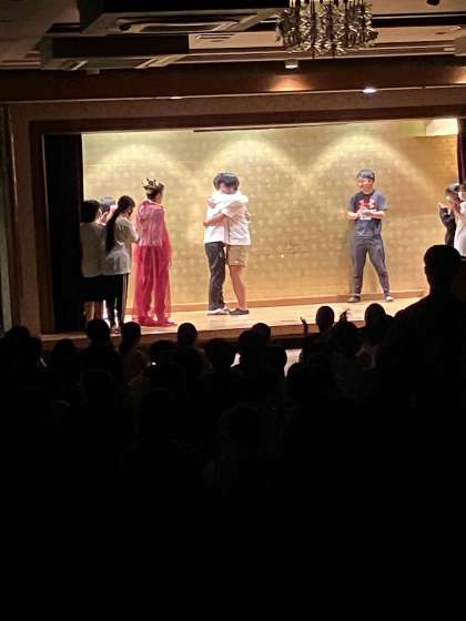 夕食後、宴会場を借りてレク係の進行でメーンイベントが開かれました。有志による歌あり、ダンスあり、クラス対抗クイズありとバラエティに富んだ内容で大いに盛り上がりました。最後は先生方による「走れメロス(港南バージョン)」が演じられ、阿蘇の夜は更けていったのでした。