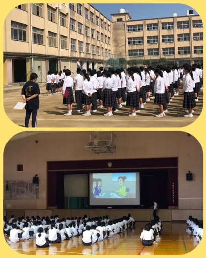 悪天候や先週の2・3年の泊行事により、中止が続いていた全校集会が久しぶりに行われました。校長先生からは、勉強への向き合い方と熱中症についてお話がありました。