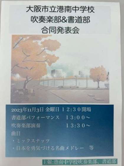11月3日(金)に開催される吹奏楽部&書道部の合同発表会について