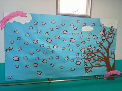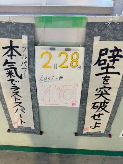 2枚目の写真は、中央階段2階に現在飾られている、3年生からのメッセージが書かれた作品です。