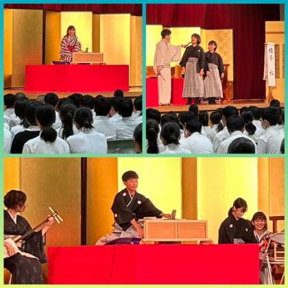 1年生6人の生徒が、落語と出囃子の体験をさせていただきました。