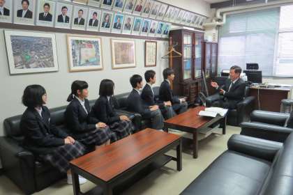 先日、生徒会の皆さんと校長室で懇談を行いました。港南中学校はどんな活動をしていますか。と聞きますと、あいさつを大切にしています。また、港南中学校の伝統を大切にしています。その中で、熊本地震や東日本大震災の募金活動を続けています。また、新たに、中央階段2階前に部活動紹介の大きなポスターを作成したお話しも聞かせてもらいました。