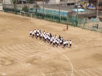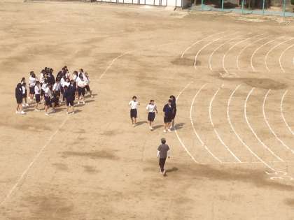 3年3、4組です。ランニングで男子がとても大きな掛け声を出しています。素晴らしい!