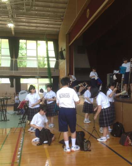 昼から築港中学校にて、合同練習をおこなっています!写真はその準備の模様です。部員は協力しきびきびと動いているので、誇らしいです!