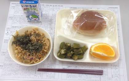 やきそば、オクラの中華あえ、オレンジ、黒糖パン、牛乳です。