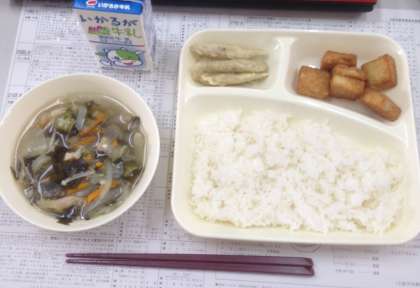 本日の給食は、いわしの天ぷら、五目汁、あつあげ、牛乳です。