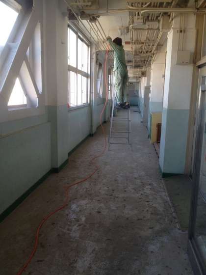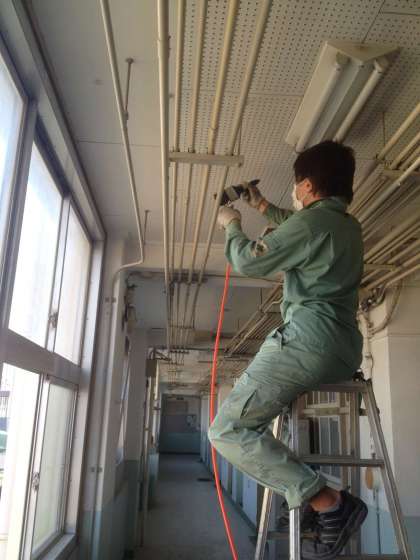 校内の廊下、天井付近の配管うえの、何年分もの埃(ほこり)を清掃してくださっています。暑い中、管理作業員さん、ありがとうございます。