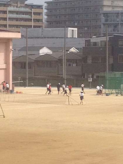おはようございます。今日の気温も33度と暑いですが、グランドでは、朝からテニス部とソフト部が練習しています。