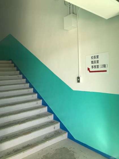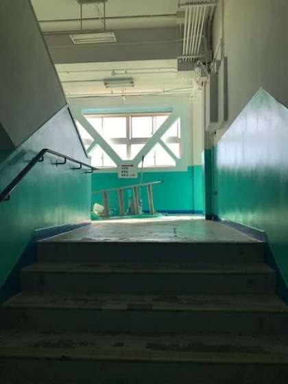 学校の1階から2階への階段 そして壁が綺麗になってきました。管理作業員の皆さんありがとうございます。