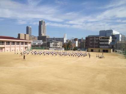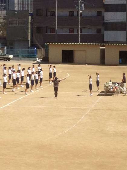 続いて、3年生です。まずは、準備体操です。教員も体操しています。