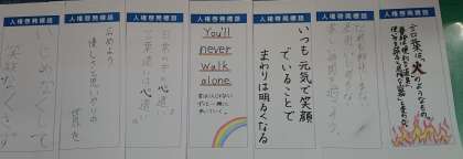 1年生の国語の宿題で取り組んだ、ここに展示される人権啓発標語の作品のうちのいくつかです。
