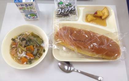 豚肉といかの中華煮、大学いも、ミニフィッシュ、パンプキンパン、牛乳です。