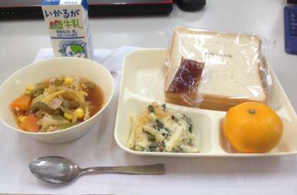 鶏肉と野菜のケチャップ煮、ほうれん草のグラタン、みかん、食パン、イチゴジャム、牛乳です。