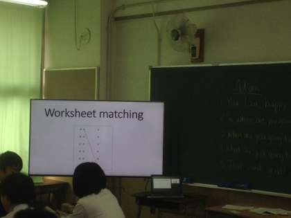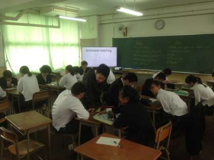 生徒たちは二人ずつ、会話をしています。みんな、一生懸命に取り組んています。