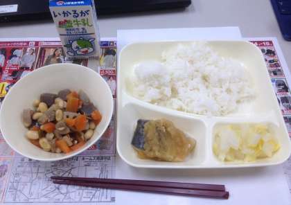 さごしのおろしじょうゆかけ、五目豆、はくさいの甘酢あえ、ご飯、牛乳です。