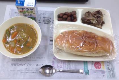 豚肉とだいこんのカレー、牛肉の香味焼き、うずら豆のグラッセ、レーズンパン、牛乳です。