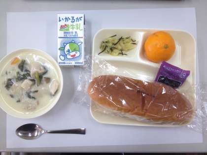 きのこと鶏肉のクリームシチュー、コッペパン、キャベツとひじきのドレッシング、みかん、牛乳、ブルーベリーのジャムです。
