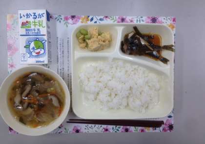 いわしのしょうが煮、里芋と椎茸のうすくず汁、高野どうふの卵とじ、抹茶大豆、ご飯、牛乳です。